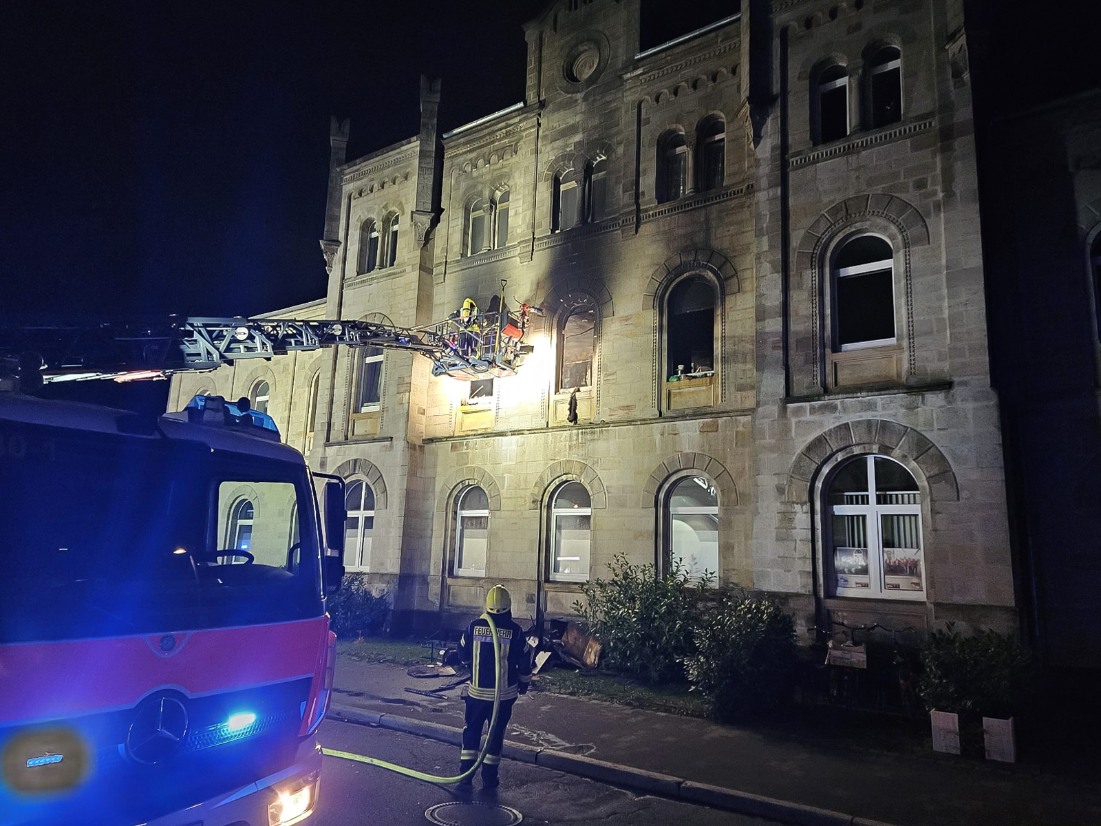 Die Löscharbeiten dauern weiterhin an, da Teile der Zimmerdecke eingestürzt sind und eine Brandbekämpfung im Innenbereich erschweren.