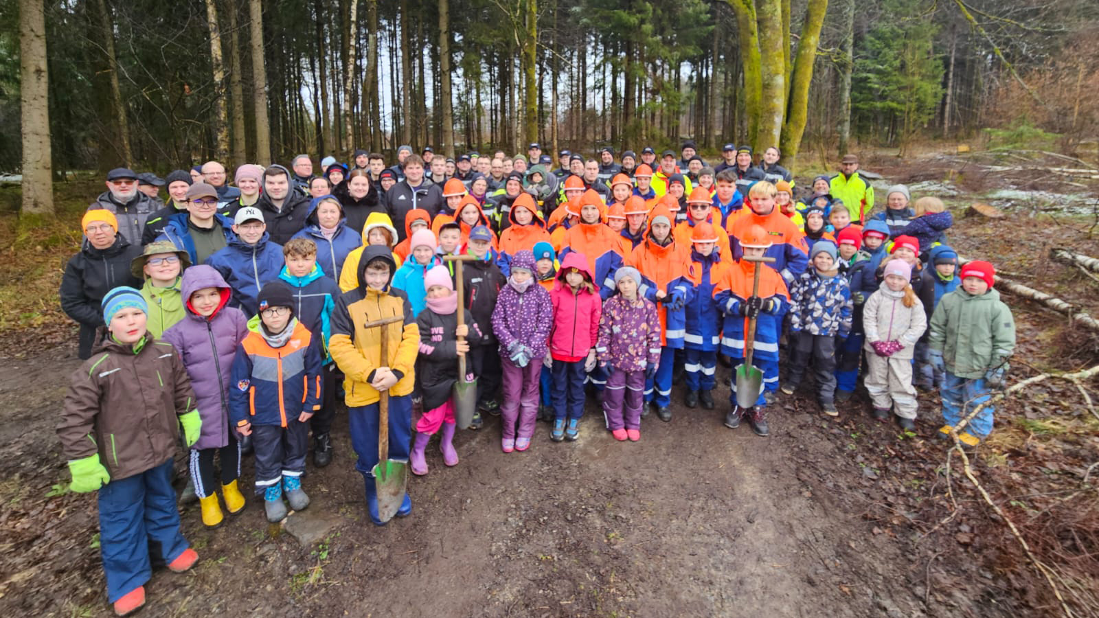 Etwa 90 Mitglieder der Kinder- und Jugendfeuerwehren aus Holzminden, Neuhaus und Silberborn beteiligten sich an der Aktion. Mit Spaten ausgerüstet setzten sie die Setzlinge in vorbereitete Pflanzlöcher und drückten den Boden anschließend sorgfältig an, damit die jungen Bäume gute Wachstumsbedingungen haben. Die Witterung verlangte den Helferinnen und Helfern einiges ab: Regen, Sonnenschein und sogar Schneeregen wechselten sich im Laufe des Vormittags ab. Entsprechend ausgerüstet ließen sich die Teilnehmenden davon jedoch nicht aufhalten.