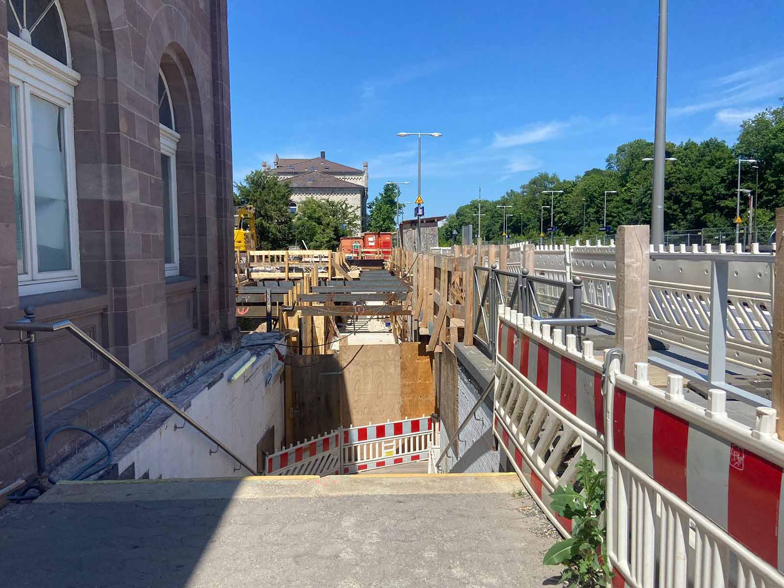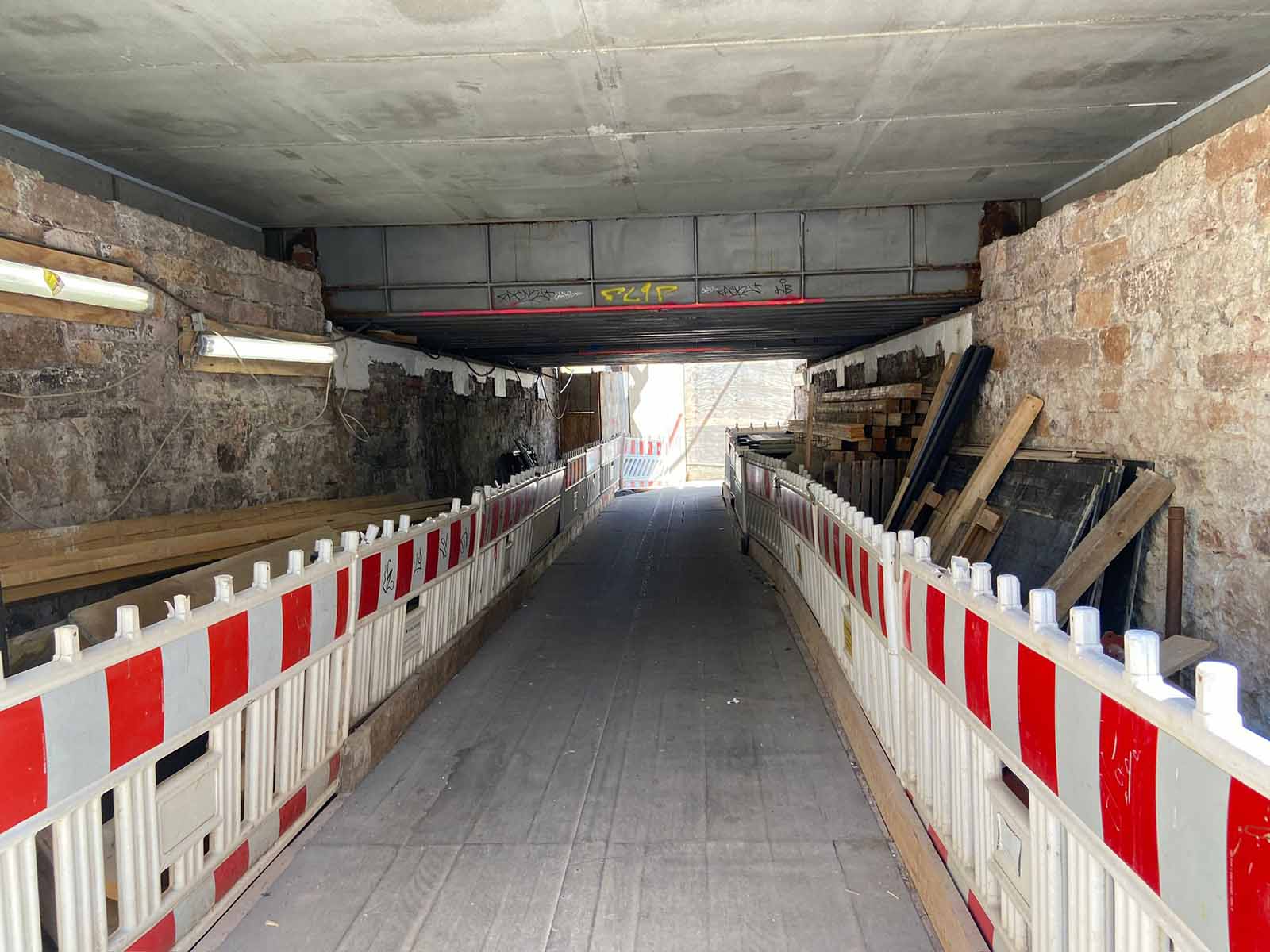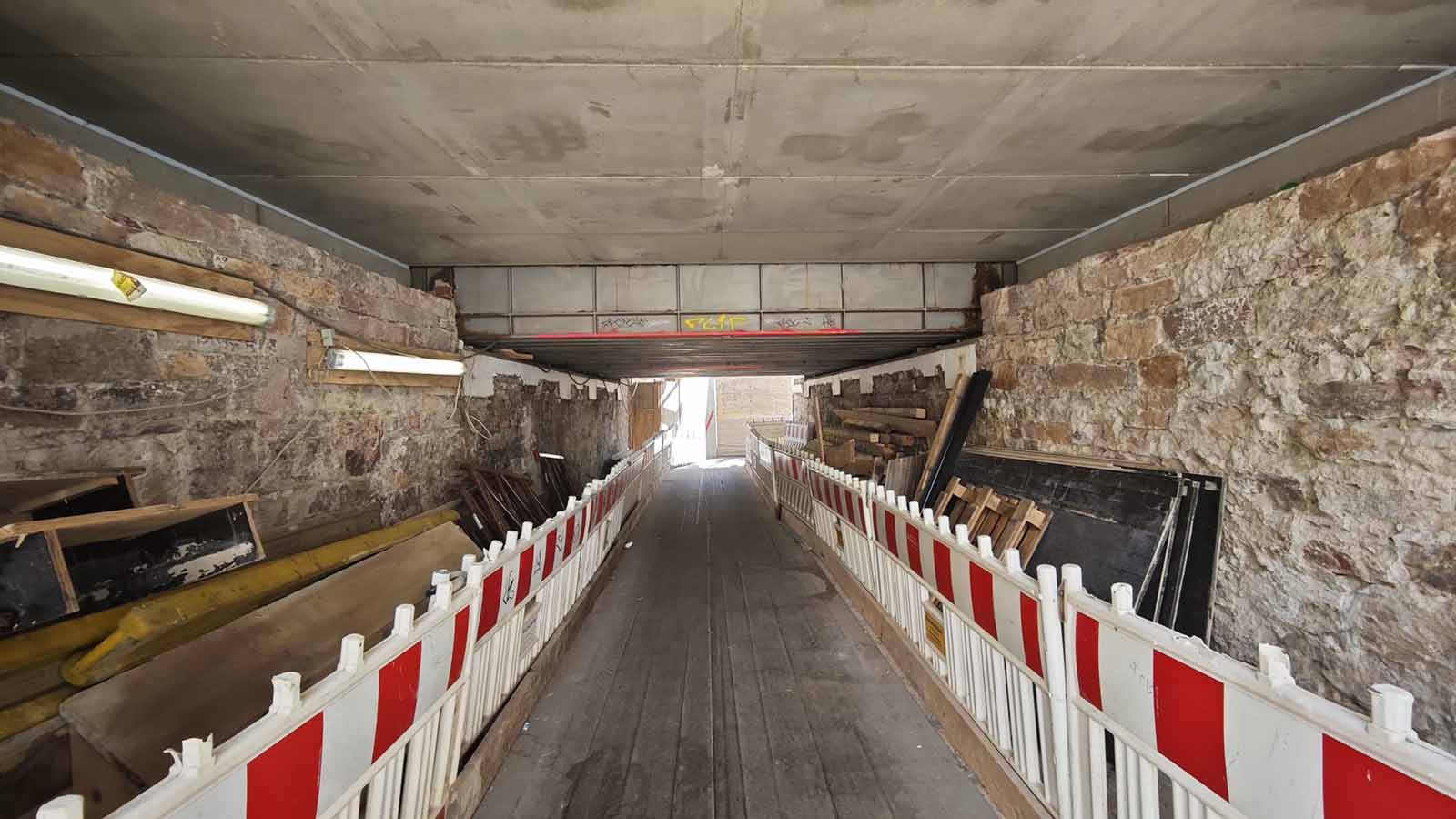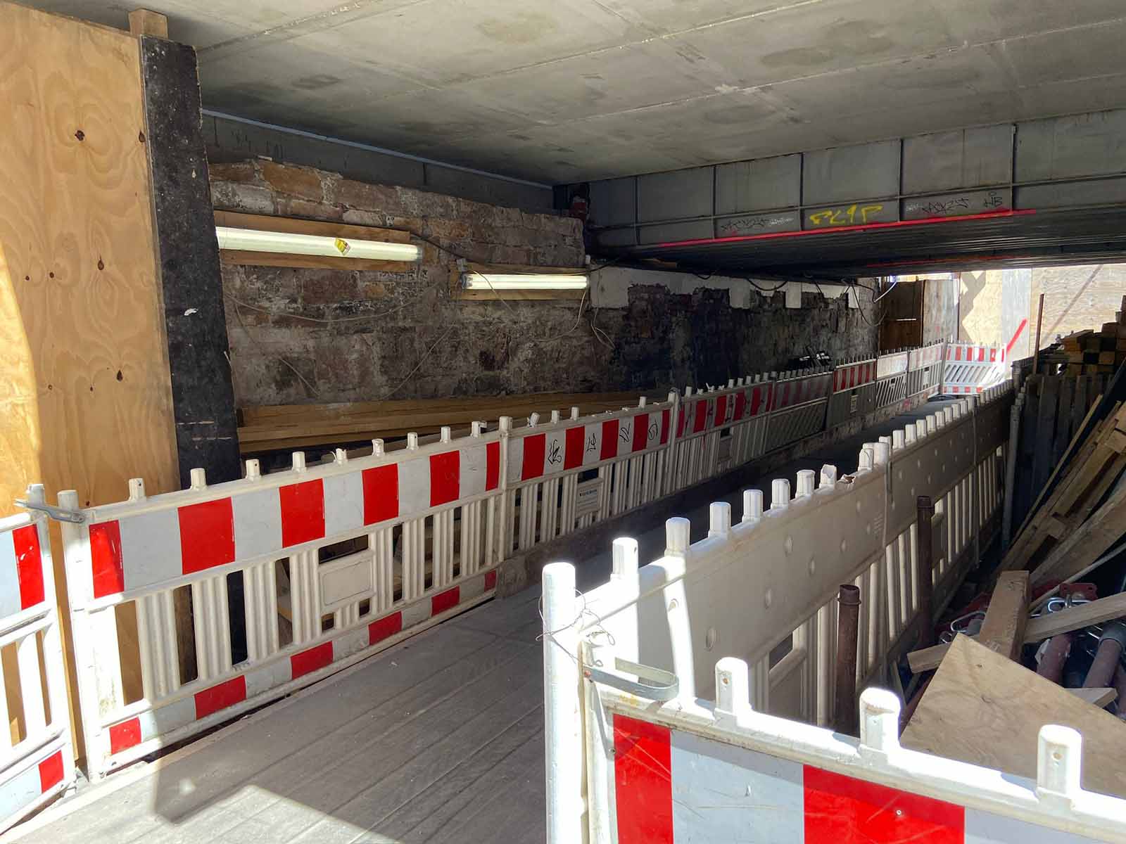 Ein zentrales Element des Umbaus ist die Sanierung der Personenunterführung (PU) samt Treppenanlagen. Hier werden derzeit die Planungen überarbeitet und an die baulichen Gegebenheiten angepasst. Aktuell prägen noch alte Wandfliesen, Bauschutt und Bauzäune das Bild – das Mauerwerk der vergangenen Jahrzehnte ist an vielen Stellen sichtbar freigelegt. Dennoch zeigt sich: Die Vorbereitungen für die nächste Bauphase laufen.