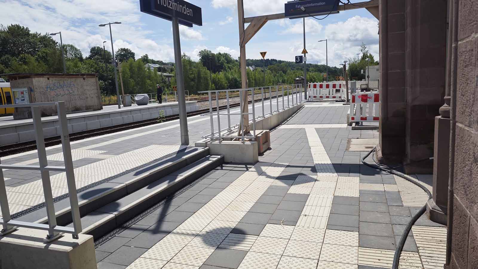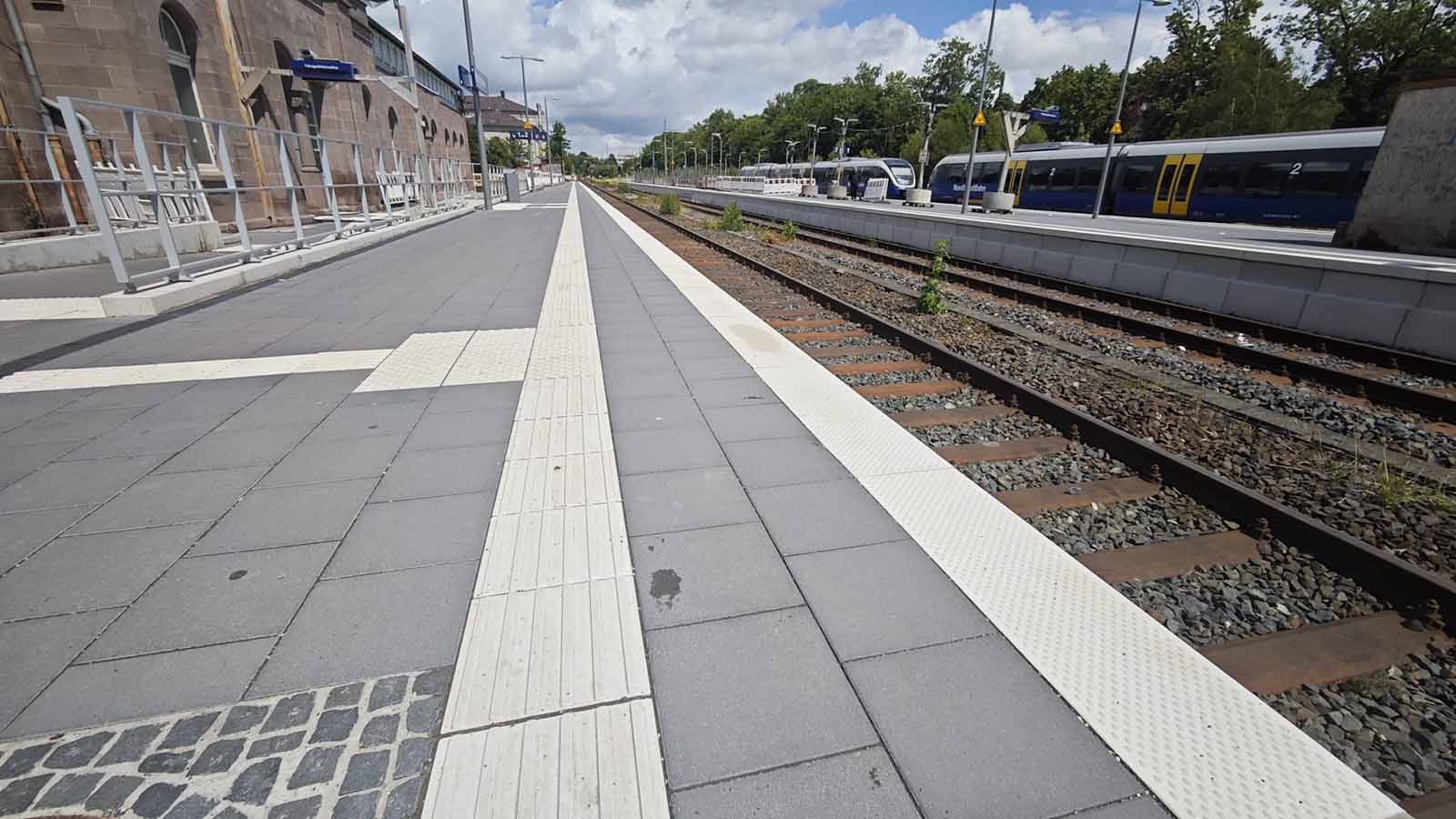 Die überarbeiteten Bahnsteige präsentieren sich mit frischem weißen Anstrich auf den Leitstreifen – einem Bestandteil des taktilen Bodenleitsystems für blinde und sehbehinderte Menschen – sowie sauber verlegten Pflastersteinen. Neue Geländer sorgen zusätzlich für klare Abgrenzungen zwischen dem Bahnsteig und dem Weg entlang des Bahnhofgebäudes, der künftig den Zugang zum neu geplanten Parkplatz und zur Personenunterführung ermöglichen soll.