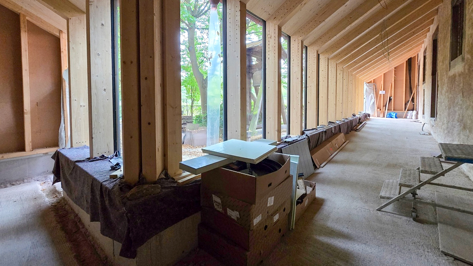 Im Obergeschoss hat er reversible Holzwände eingezogen, um den Raum funktional zu gestalten und gleichzeitig historische Substanz zu bewahren. Künftig ermöglicht eine Glasscheibe Einblicke in den landwirtschaftlich genutzten Gebäudeteil und macht die Geschichte der Domäne sichtbar.