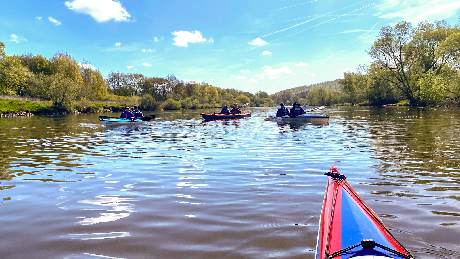 Die Gruppe startete morgens in Holzminden und nahm Kurs auf Heinsen. Bereits nach wenigen Kilometern wurden die ersten Spuren des Bibers sichtbar – Fraßstellen an Weiden und Fußspuren am Ufer zeigten, dass das größte Nagetier Europas hier wieder aktiv ist. Weitere Spuren wurden im Verlauf der Tour vor den Ortschaften Polle und Reileifzen gesichtet.