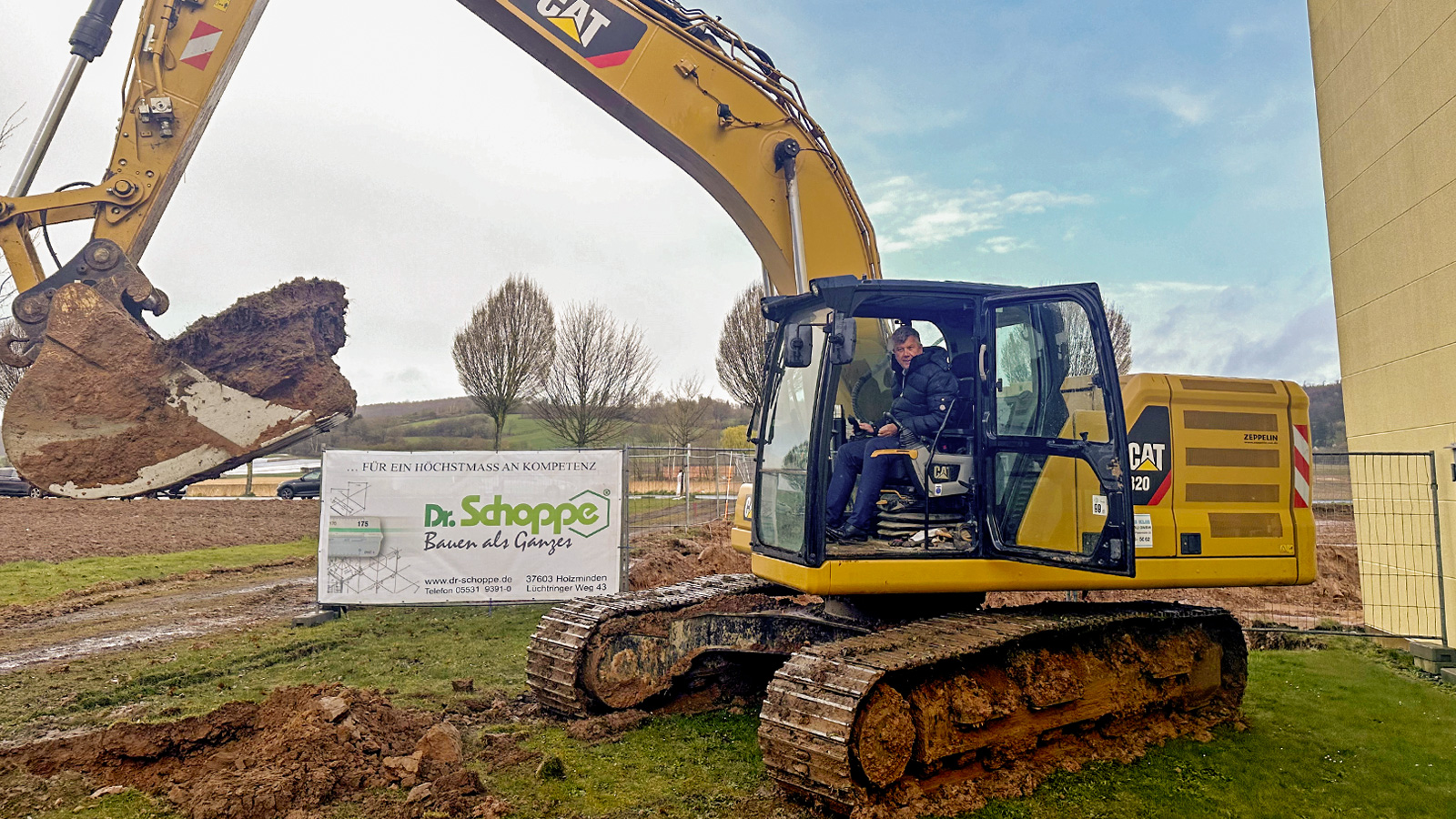 Ein besonderer Moment: Geschäftsführer Ralf Streicher nahm selbst im Bagger Platz und führte den ersten Aushub durch – unterstützt von den Projektbeteiligten, die den Baubeginn mit Spaten und Schutzhelmen begleiteten.