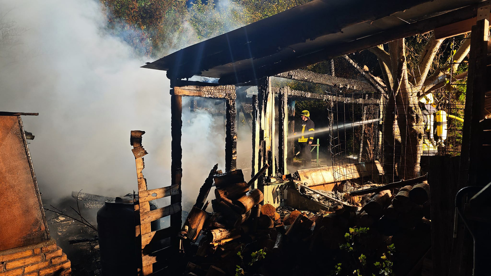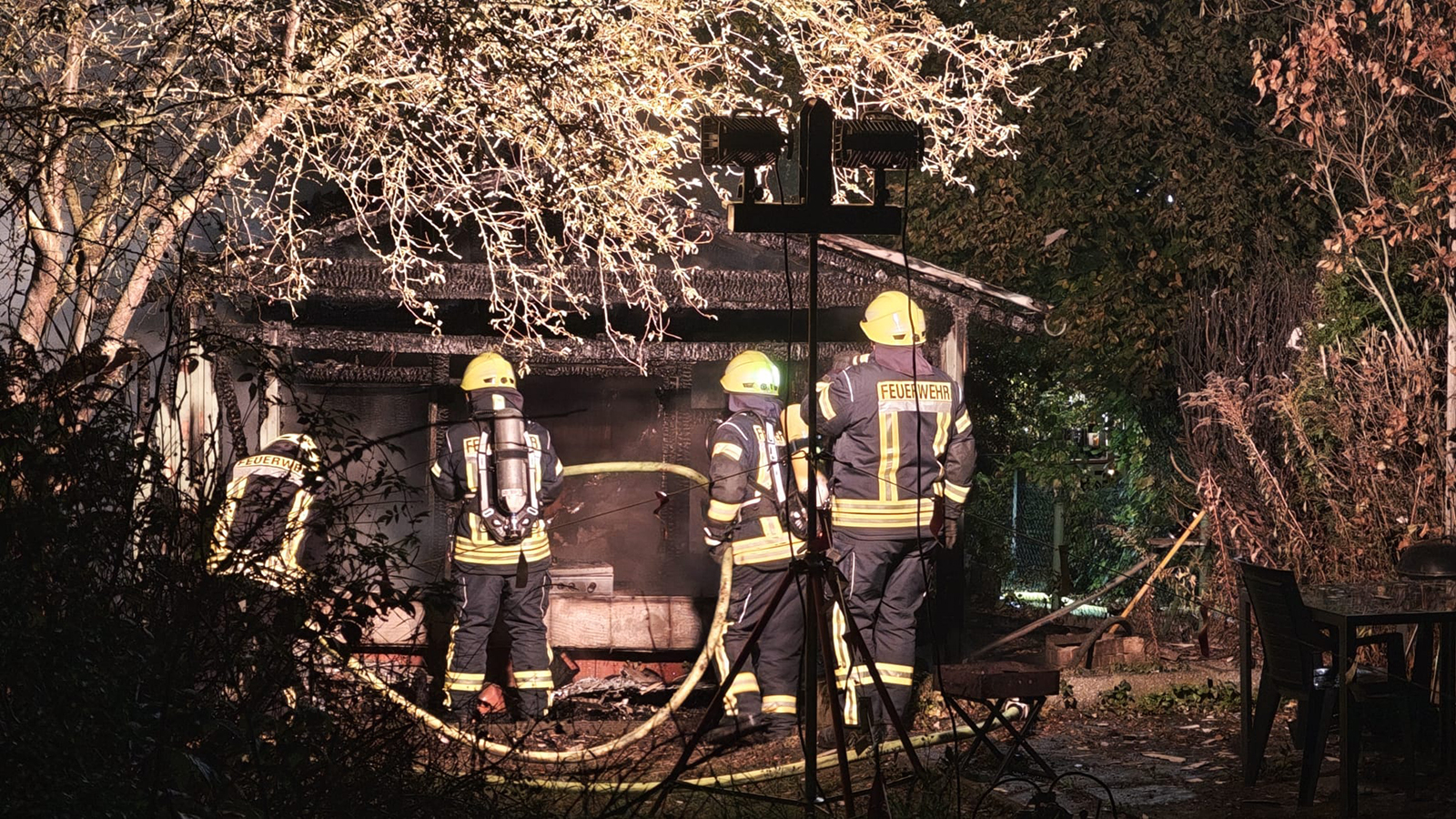 Beim Eintreffen der Einsatzkräfte stand eine Gartenhütte bereits komplett in Vollbrand. Das Feuer hatte zudem auf eine angrenzende Hütte übergegriffen, die zur Hälfte abbrannte. Trotz des schnellen Eingreifens der Feuerwehr war eine der beiden Hütten nicht mehr zu retten.