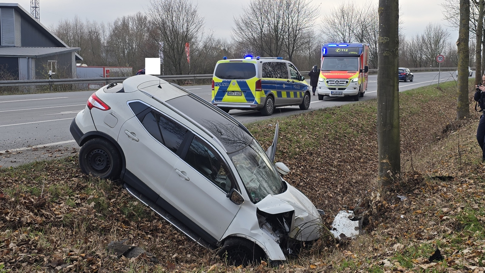 Höxter (TKu). Auf der Bundesstraße 64 ist es am Mittwoch kurz vor Mittag zu einem Verkehrsunfall gekommen. Gegen kurz vor 12 Uhr verlor ein etwa 40-jähriger Mann in Höhe der Eugen-Diesel-Straße die Kontrolle über seinen Pkw. Nach bisherigen Erkenntnissen war der Mann mit seinem Nissan Qashqai von Albaxen in Fahrtrichtung Höxter unterwegs, als er aus bislang ungeklärter Ursache nach rechts von der Fahrbahn abkam. Das Fahrzeug fuhr durch einen Graben, prallte gegen einen Baum und kam schließlich im Graben zum Stillstand.
