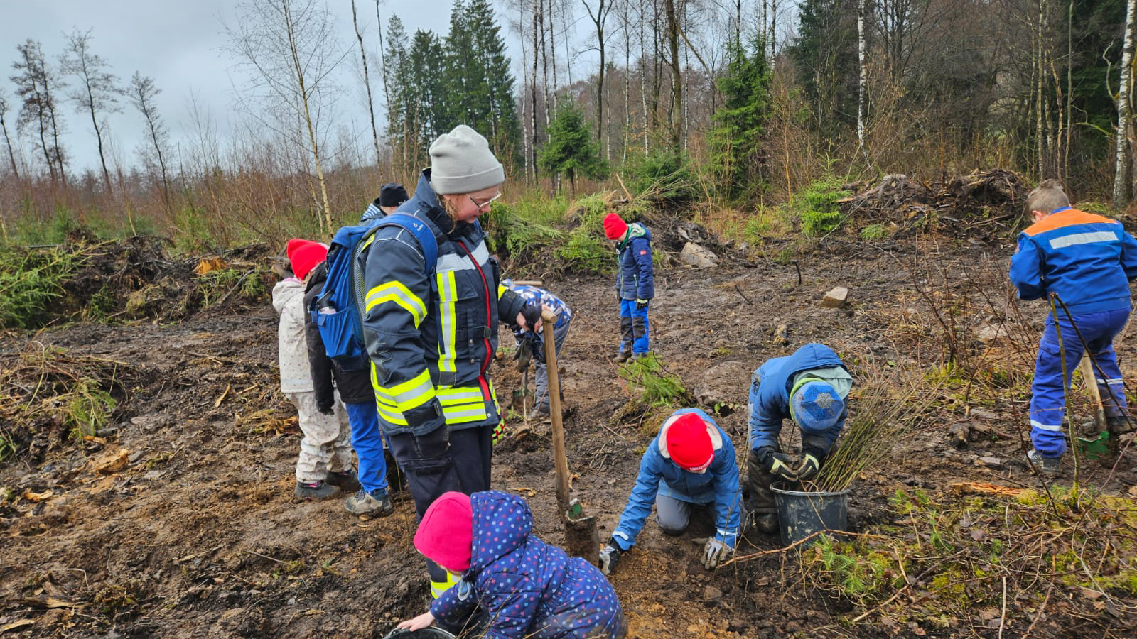 Etwa 90 Mitglieder der Kinder- und Jugendfeuerwehren aus Holzminden, Neuhaus und Silberborn beteiligten sich an der Aktion. Mit Spaten ausgerüstet setzten sie die Setzlinge in vorbereitete Pflanzlöcher und drückten den Boden anschließend sorgfältig an, damit die jungen Bäume gute Wachstumsbedingungen haben. Die Witterung verlangte den Helferinnen und Helfern einiges ab: Regen, Sonnenschein und sogar Schneeregen wechselten sich im Laufe des Vormittags ab. Entsprechend ausgerüstet ließen sich die Teilnehmenden davon jedoch nicht aufhalten.