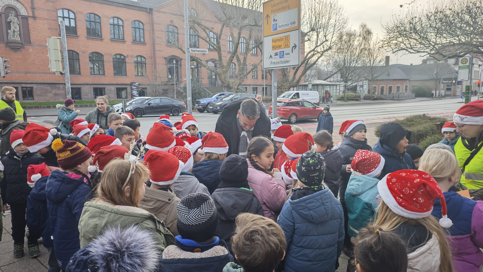 Auch Holzmindens Bürgermeister Christian Belke ließ es sich nicht nehmen, bei der Feier vorbeizuschauen. In seiner Ansprache bedankte er sich herzlich bei den Kindern: „Schön, dass ihr hier seid. Danke, dass ihr hier feiert.“ Besonders gerührt zeigte er sich darüber, dass er während einer Krankheit Genesungswünsche von den Schülerinnen und Schülern erhalten hatte. Als Dankeschön überreichte er einen Gutschein für die Eisbahn auf dem Holzmindener Weihnachtsmarkt.