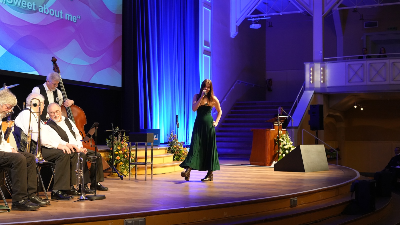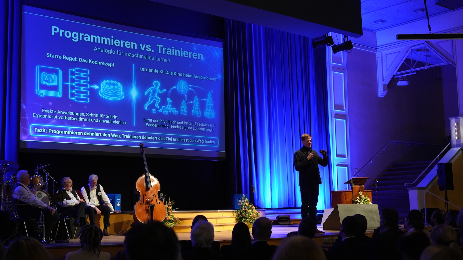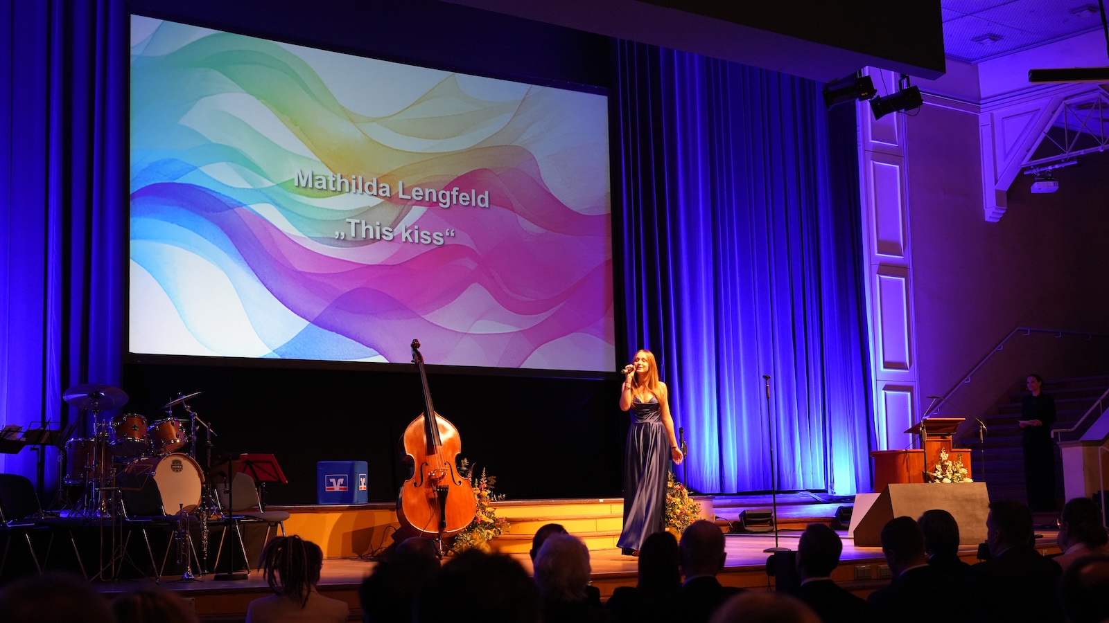 Vor der Festrede von Prof. Dr. Jan Schlüter von der HAWK sorgte Mathilda Lengfeld mit dem Song „This Kiss“ für ein weiteres musikalisches Highlight. In seinem Vortrag „KI – Versteher, Helfer oder Gefahr? Eine Reise in die Welt der KI“ erklärte Schlüter anschaulich und unterhaltsam - unter Einbeziehung des Publikums - die Funktionsweise künstlicher Intelligenz, zeigte Chancen auf und warnte zugleich vor Risiken wie Fakenews. Trotz der Herausforderungen betonte er: „Wir können mit Hilfe von KI die Arbeit minimieren, um dann bessere Leistungen und Resultate zu erzielen – intelligente Faulheit!“