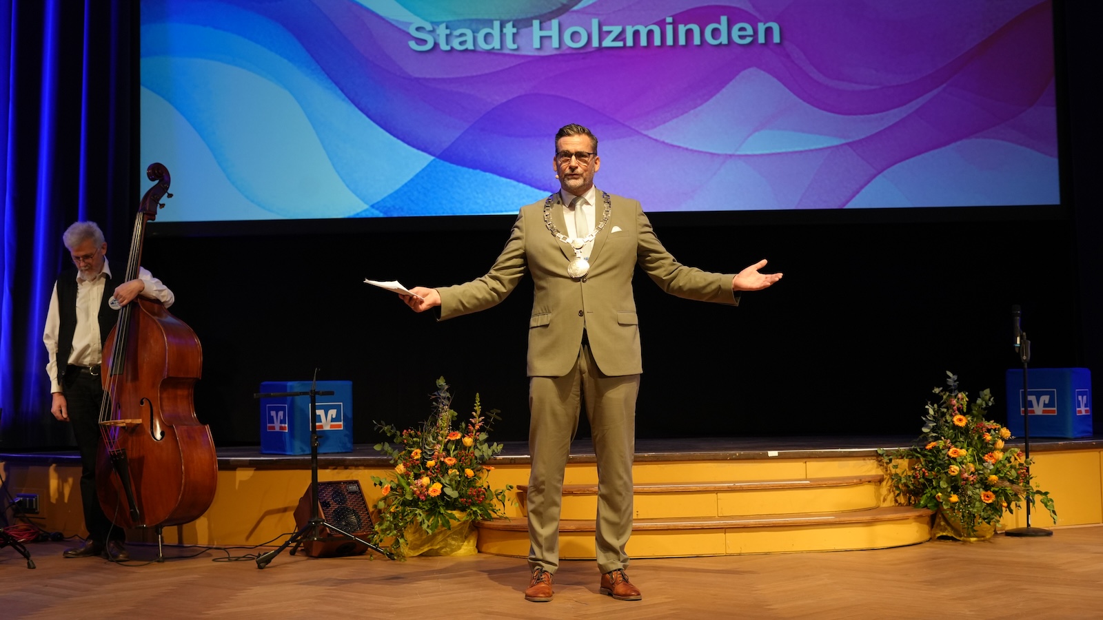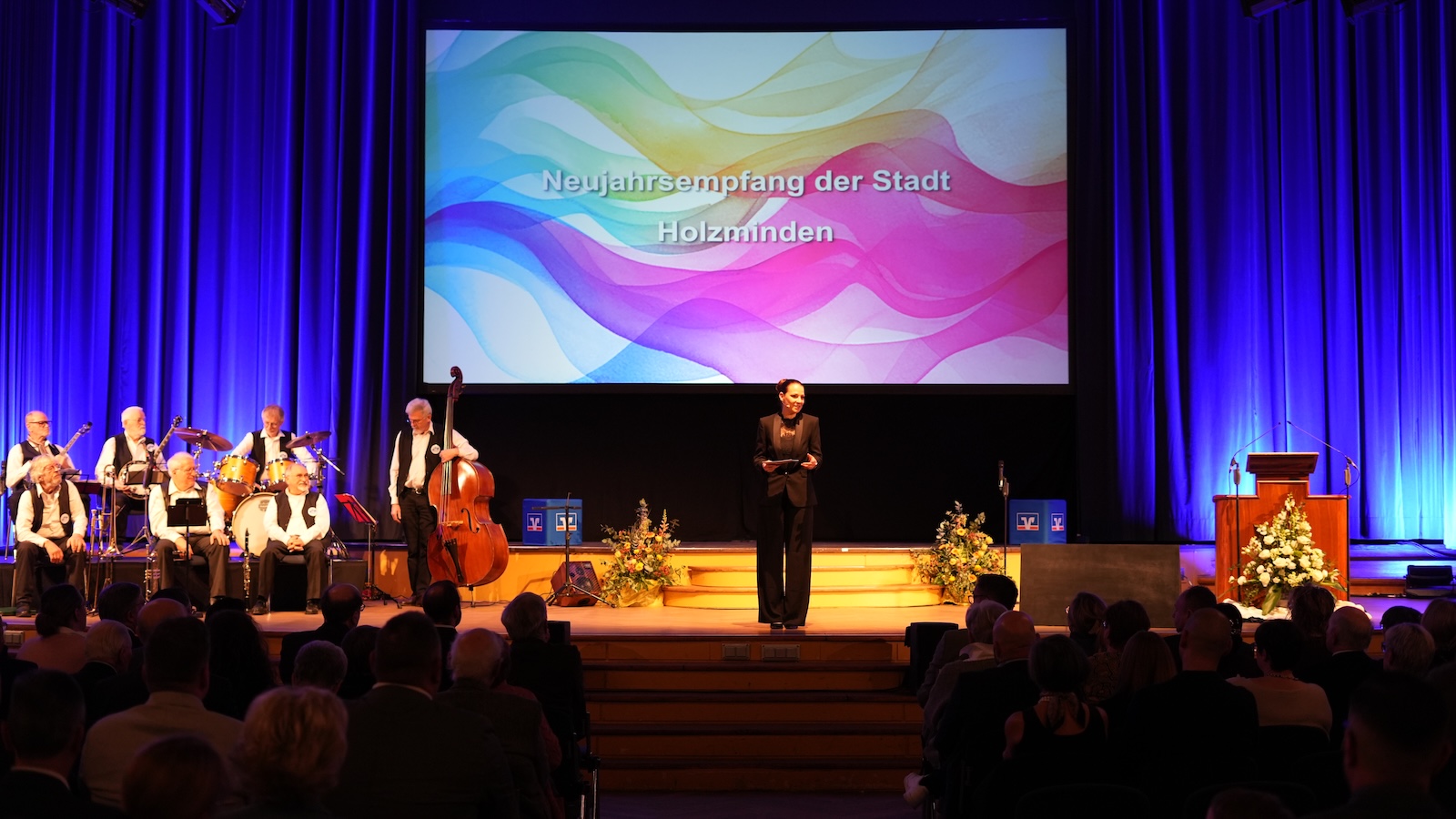 Der Empfang begann um 11.30 Uhr mit einem Sektempfang im Foyer der Stadthalle, musikalisch begleitet von atmosphärischen Jazztönen der Holzmindener Band „Sleepy Town“. Anschließend eröffnete Silvia Backhaus das Programm und führte souverän durch die Veranstaltung. Nach einem musikalischen Beitrag von Emma Golüke mit dem Song „Sweet about me“ betrat Bürgermeister Christian Belke die Bühne.