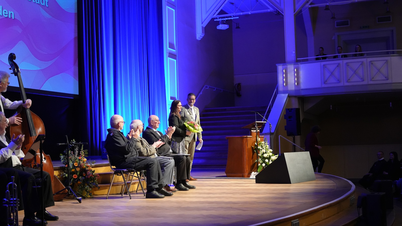 Zum Abschluss versammelten sich alle Preisträger und Mitwirkenden auf der Bühne. Bei Backwaren und Getränken im Foyer klang der Neujahrsempfang bei anregenden Gesprächen bis in den Nachmittag aus.