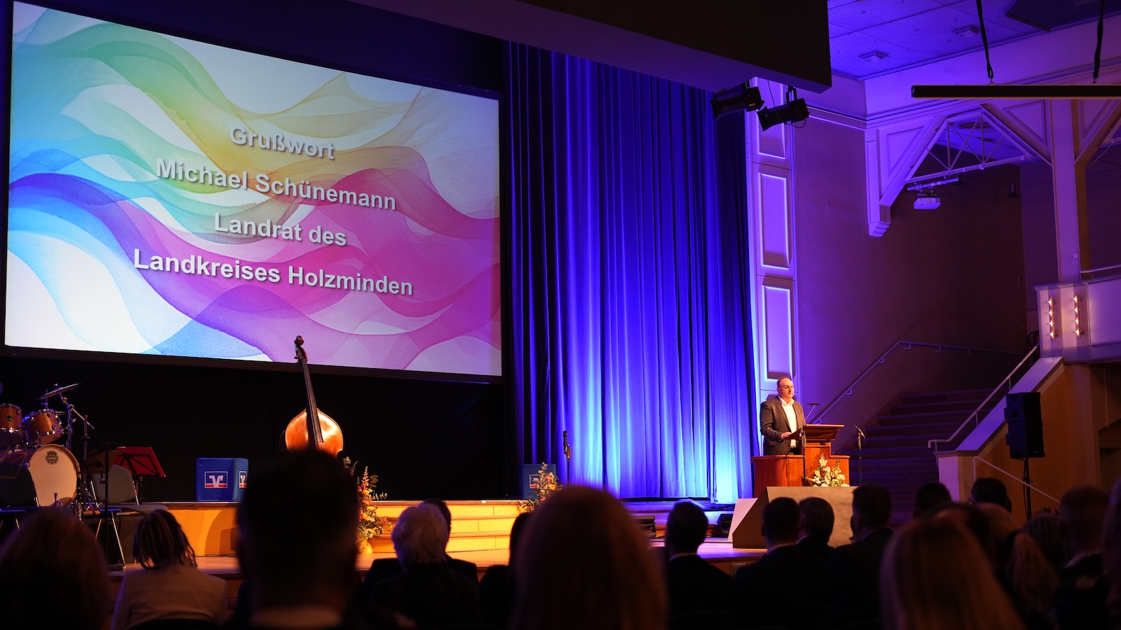 Landrat Michael Schünemann griff dies in seiner anschließenden Rede auf und wettete, dass Belke auch im kommenden Jahr den Neujahrsempfang als Bürgermeister leiten werde. Er lobte die positive Entwicklung im Landkreis, insbesondere die Schulentwicklung in Holzminden. Bei anstehenden Bauprojekten (Sporthalle) setze man auf „Kleckern statt Klotzen“. „Da entsteht etwas, das wird richtig groß“, so Schünemann.